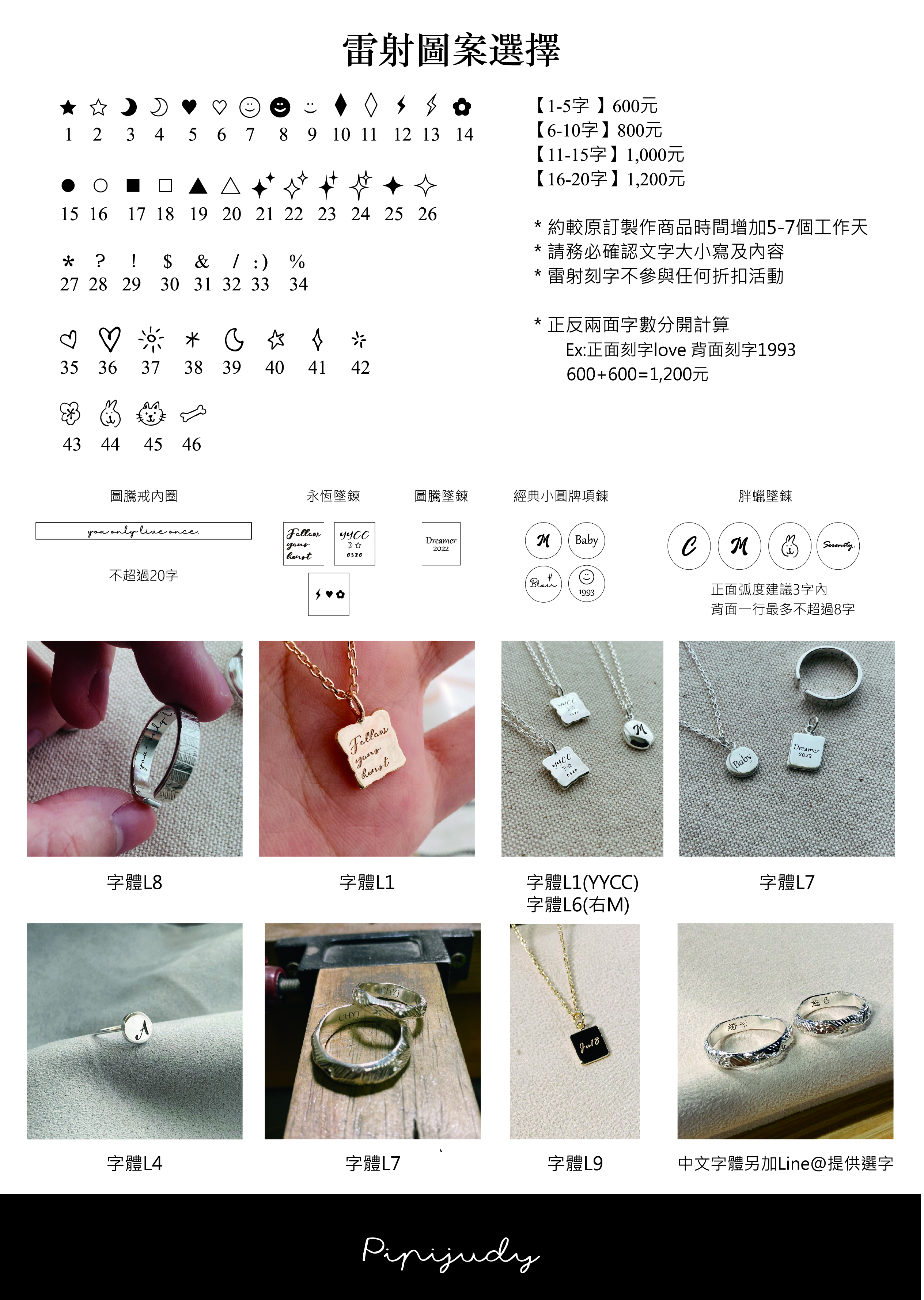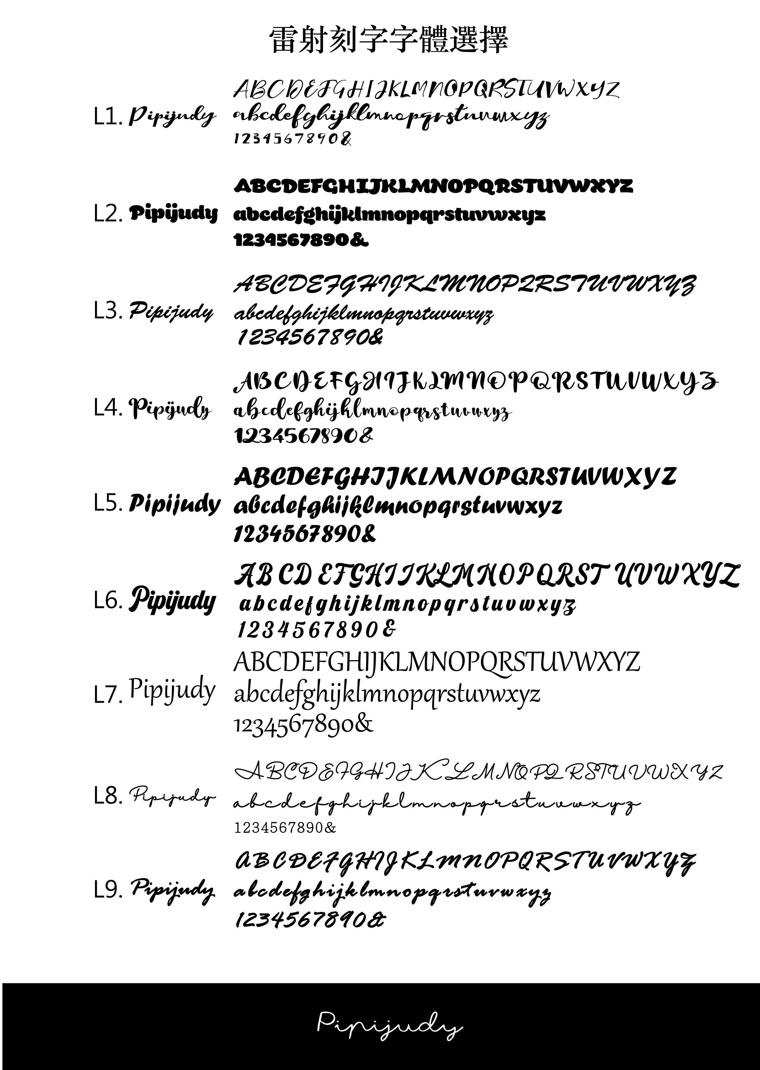 • 字體選擇:提供多種字體可挑選,下單時請於備註欄註明 字體編號 + 刻字內容